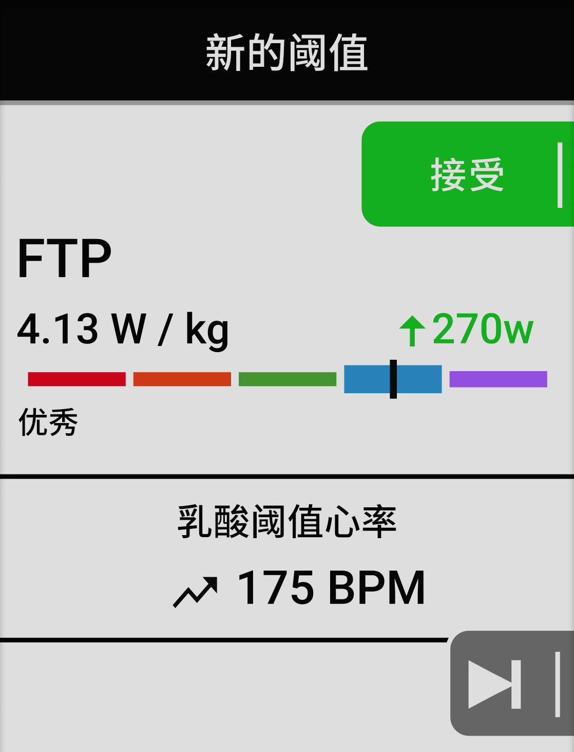 页面会显示以瓦特/千克为单位的 FTP 估算值,并在彩色量表上显示输出功率的位置。