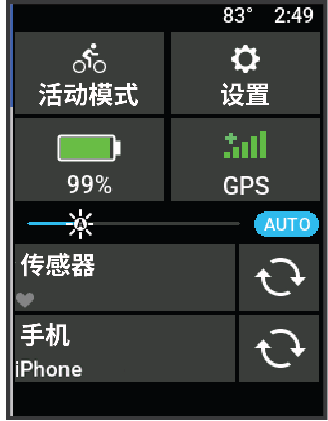查看小工具设备已预置多种常用小工具,也可通过兼容手机的 Connect IQ 应用下载其他小工具。 在主页面,从屏幕顶部向下轻滑。置工具显示,闪烁的图标表示设备正在搜索信号,常亮图标表示已找到信号或传感器已连接。可选择任意图标更改设置。 向左或向右轻滑查看更多小工具。 下次再向下轻滑查看小工具时,将显示你上次查看的小工具。主页产品介绍设备概述查看小工具