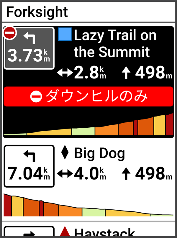 ForkSightとは、Trailforksマップでのトレイルのナビゲーションを実行中に分岐に到達するたびにユーザーにトレイルの情報を提供し、スムーズに移動できるようサポートする機能です。アクティビティ中にトレイル上で停止するとForkSightページが表示され、進路上のトレイルに関する情報(ナビゲーション、登坂や降坂、高度グラフ など)を確認できます。