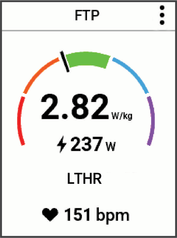 >[マイデータ]>[パワー]の順に選択します。- FTPは、パワー出力の測定値(単位はW/kg)とカラーゲージで表示されます。