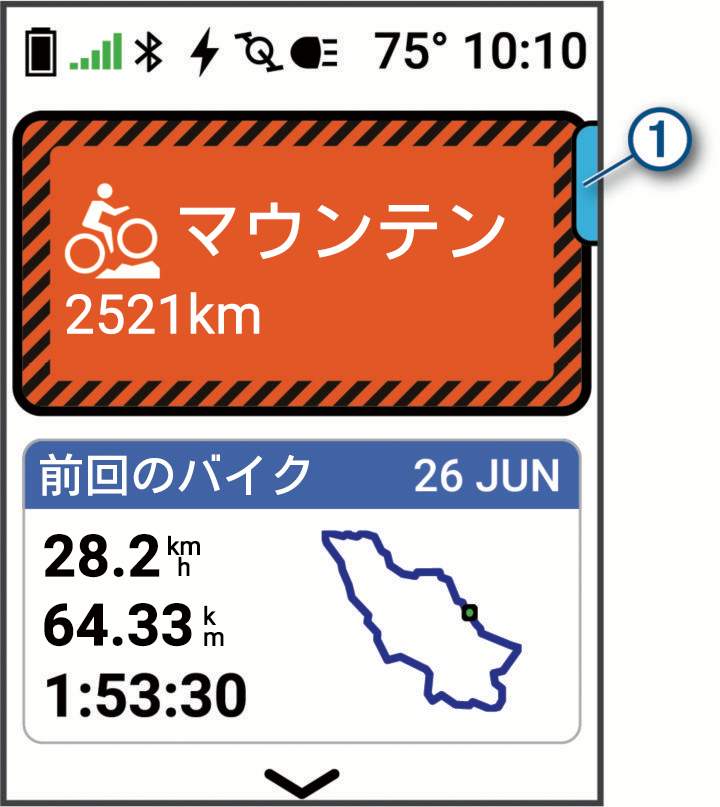 ショートカットメニューを使用するショートカットメニューからデバイスの各種機能やアクション(センサーやライドプロフィールの追加など)にすばやくアクセスできます。 画面にメニュートレイ①が表示されているときは、 を押すか長押しするとショートカットメニューを表示できます。 メニュートレイが の場合、 を押します。メニュートレイが の場合、 を長押しします。 ホームはじめにデバイス概要ショートカットメニューを使用する