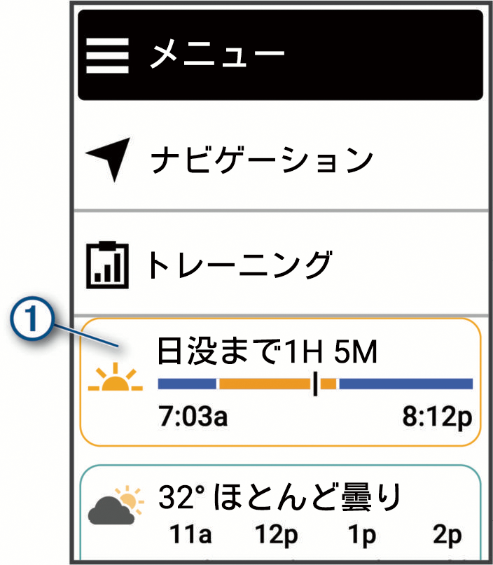 データカードを確認するデータカードでヘルスデータやアクティビティデータ、内蔵センサーの情報などに素早くアクセスできます。 ホーム画面で を押します。 データカードをスクロールできます。( デバイス概要) データカード①を選択すると、詳細を確認できます。 [編集]を選択すると、データカードをカスタマイズできます。( データカードを管理する) ホームはじめにデバイス概要データカードを確認する