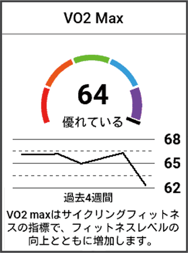- VO2 Maxは、数値とレベル別に分類されたカラーゲージで表示されます。