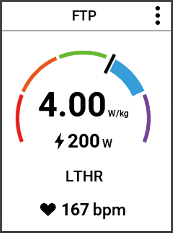 >[マイデータ]>[パワー]>[FTP]の順に選択します。- FTPは、パワー出力の測定値(単位はw/kg)とカラーゲージで表示されます。