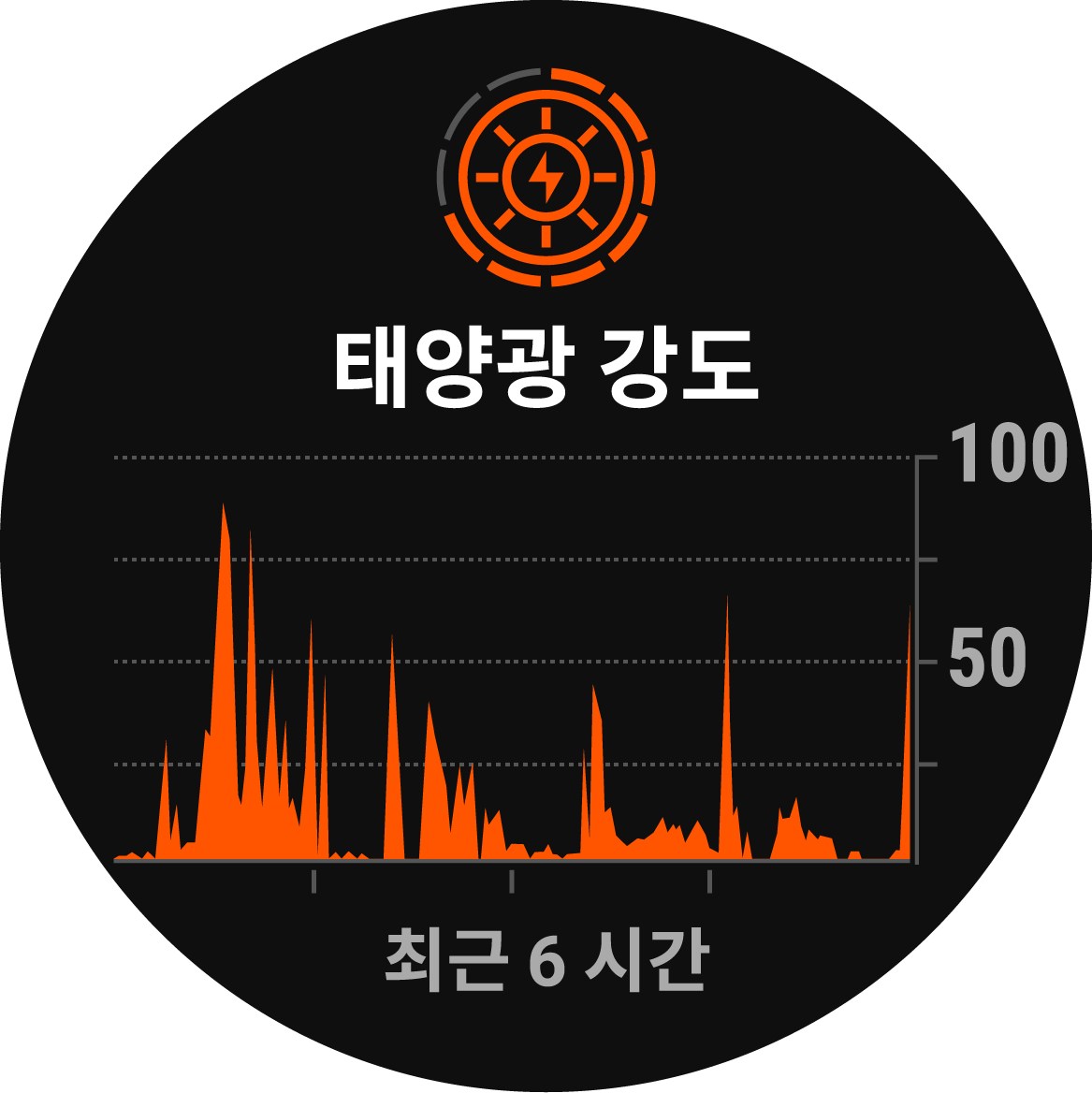 1. 시계 화면에서 UP 또는 DOWN을 눌러 솔라 에너지 위젯으로 화면을 스크롤합니다.
