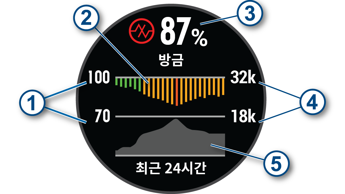 장치는 펄스 옥시미터 계측값을 산소 포화도 퍼센티지와 그래프의 색상으로 표시합니다. Garmin Connect 계정에서는 수 일 동안의 경향을 비롯하여 펄스 옥시미터 계측값에 대한 상세한 정보를 추가적으로 확인할 수 있습니다.