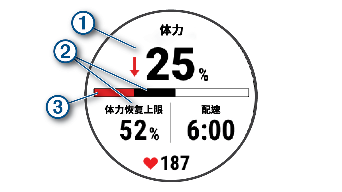 体力数据字段。显示当前的体力百分比、剩余距离或剩余时间。 |