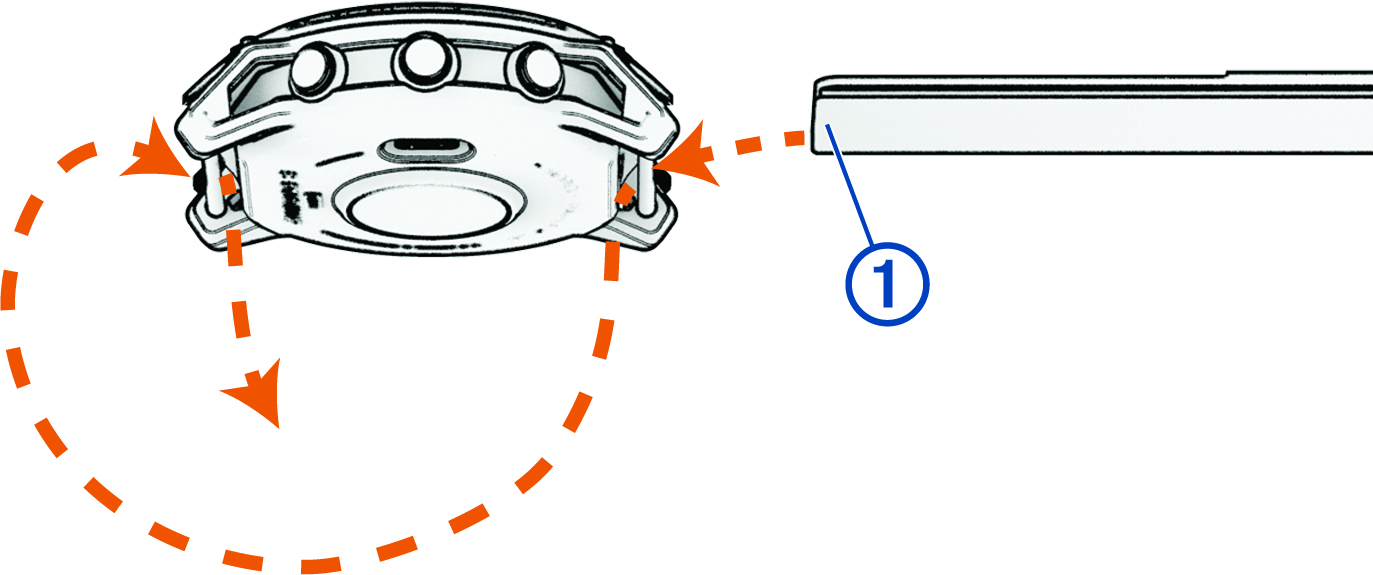 替换 UltraFit 2 尼龙表带提示:可以前往 Garmin.com/videos/ultrafit-install 观看安装表带的影片。 将有魔术贴的一面朝上,将表带较软的一端 ① 从手表正面插入手表下方的开口并拉到底。 将表带较软的一端 ① 从手表正面插入手表上方的开口。 将表带的一端 ① 的魔术贴贴牢。 将手表戴上。 调整到舒适的松紧度,将表带的另一端 ② 的魔术贴贴牢。 主页设备信息替换 UltraFit 2 尼龙表带