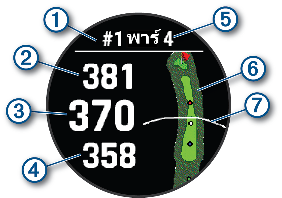 หมายเหตุ: เนื่องจากตำแหน่งธงเปลี่ยนได้ นาฬิกาคำนวณระยะทางไปถึงด้านหน้า ตรงกลาง และด้านหลังของกรีน แต่ไม่ใช่ตำแหน่งธงที่แท้จริง