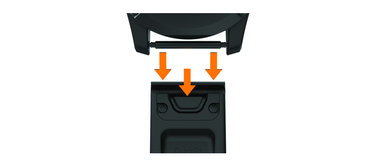 更换 QuickFit 快拆表带 滑动 QuickFit 表带上的闩锁,然后从腕表上取下表带。 将新表带与腕表对齐。 将表带按压入位。注意:确保表带牢固不脱落。闩锁应该在表针上闭合。 重复步骤 1 至 3 更改另一侧的表带。 主页设备信息更换 QuickFit 快拆表带