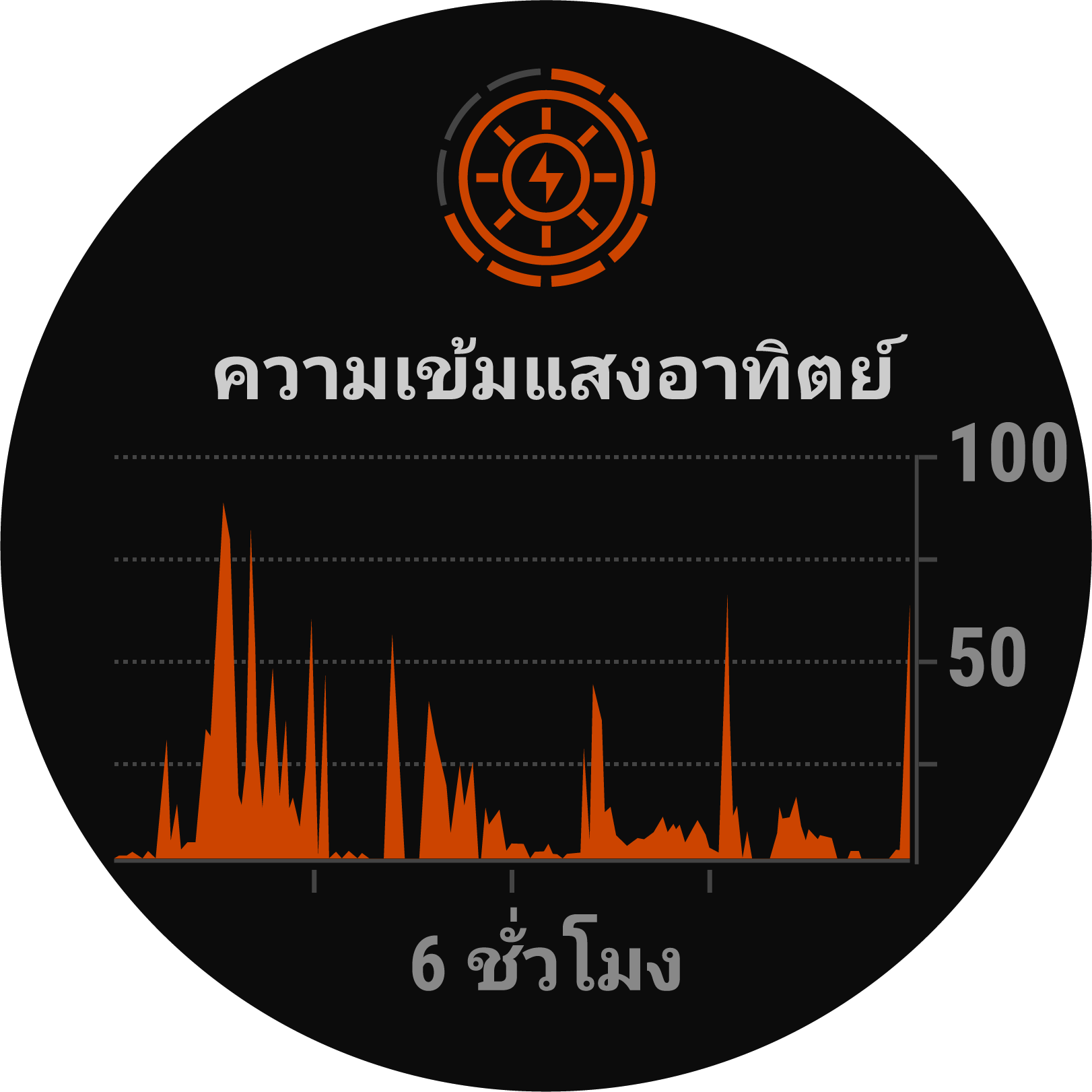 การดูวิจิทแสงอาทิตย์ จากหน้าปัดนาฬิกา, กด UP หรือ DOWN เพื่อเลื่อนไปยัง วิจิทแสงอาทิตย์ กด เพื่อดูกราฟความเข้มของแสงอาทิตย์ที่ได้รับสำหรับ 6 ชั่วโมงล่าสุด หน้าหลักการชาร์จด้วยแสงอาทิตย์การดูวิจิทแสงอาทิตย์