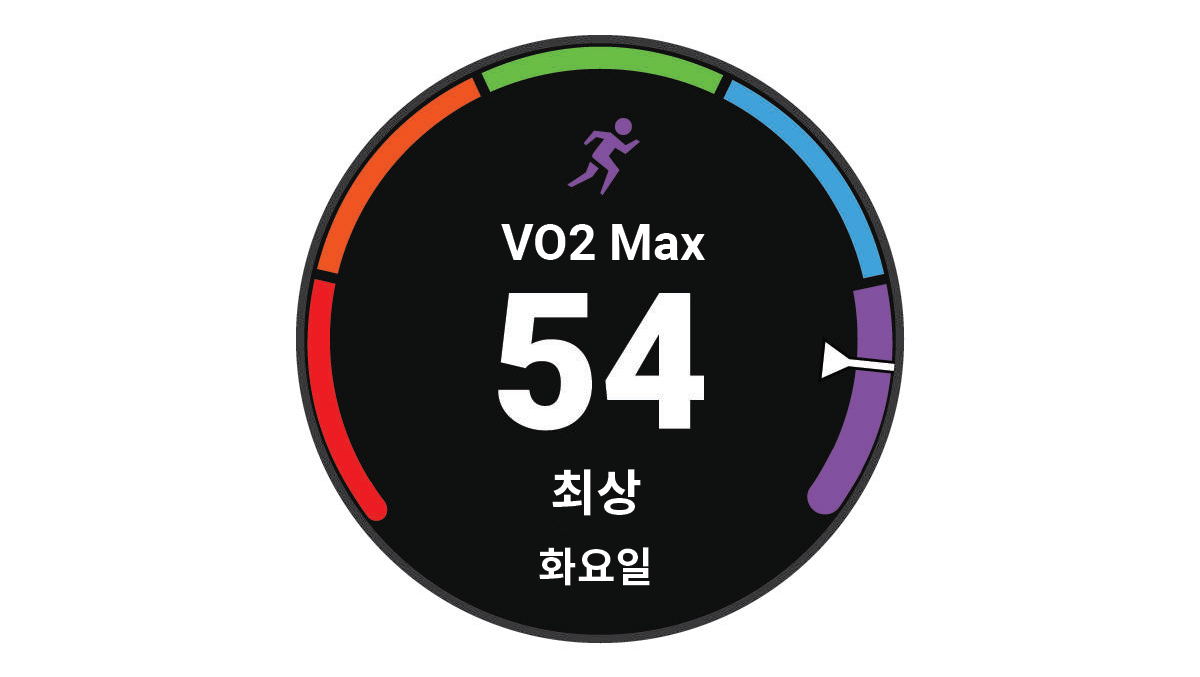 참고: 장치가 정확한 VO2 Max 추정치를 구하고 사용자의 러닝 또는 라이딩 능력을 알아내려면, 심박계를 착용한 상태로 몇 번의 러닝 또는 라이딩을 실시해야 합니다 (22 페이지, VO2 Max. 추정치에 대하여).