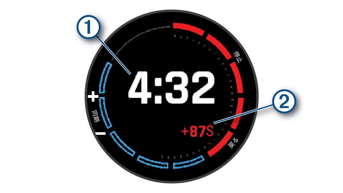 を押して、デバイスのレースタイムを設定します。- 注意:表示される秒数がマイナスの場合、スタート時刻からその秒数が経過したあとに、スタートラインを通過する予定です。表示される秒数がプラスの場合、スタート時刻よりその秒数だけ早くスタートラインを通過する予定です。