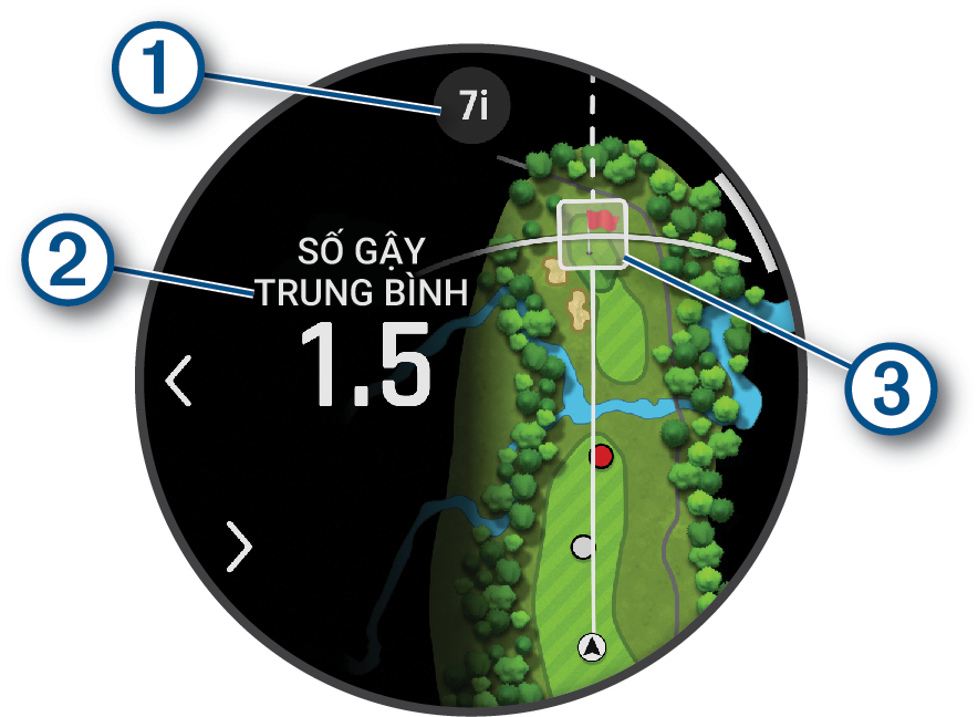 Caddie ảo: Cho phép bạn chọn gậy đề xuất caddie ảo tự động hoặc thủ công. Xuất hiện sau khi bạn chơi năm vòng gôn, theo dõi số gậy và tải bảng điểm của bạn lên ứng dụng Garmin Golf.