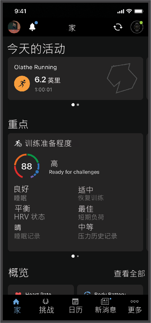 分析资料:查看更多关于健身和户外活动的详细信息,包括时间、距离、高度、心率、热量消耗、回转数、最大摄氧量、跑步动态数据、活动鸟瞰图、配速和速度表……等,甚至自定义分析报表。