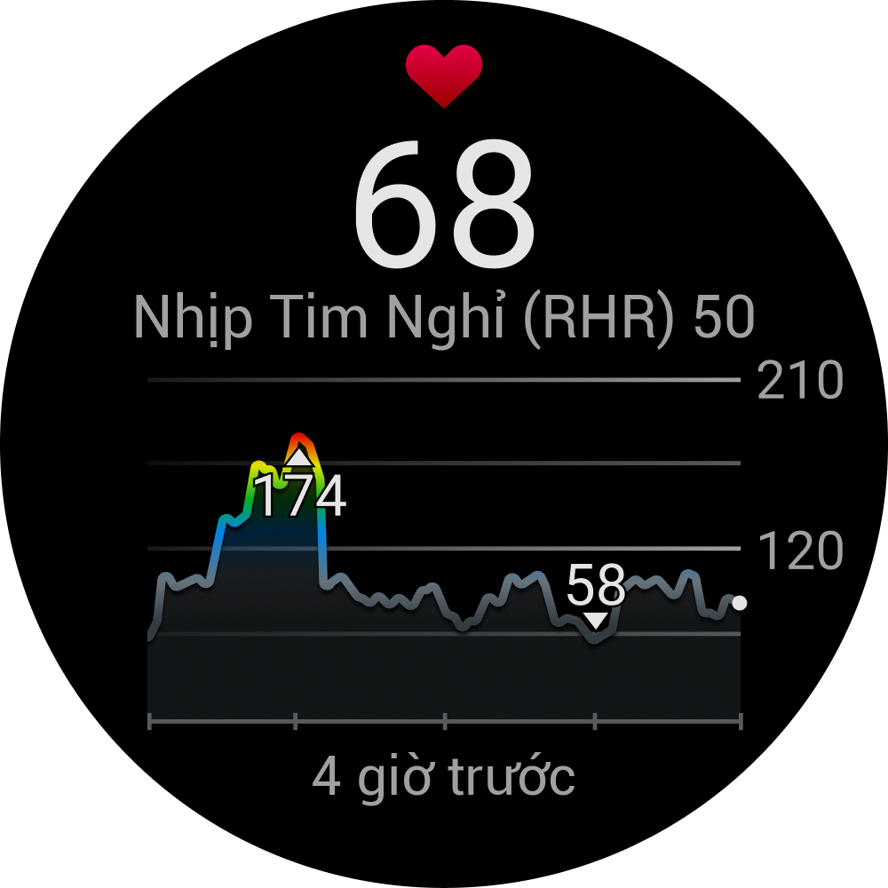 - Từ mặt đồng hồ, nhấn UP hoặc DOWN để xem công cụ tổng quan về nhịp tim.