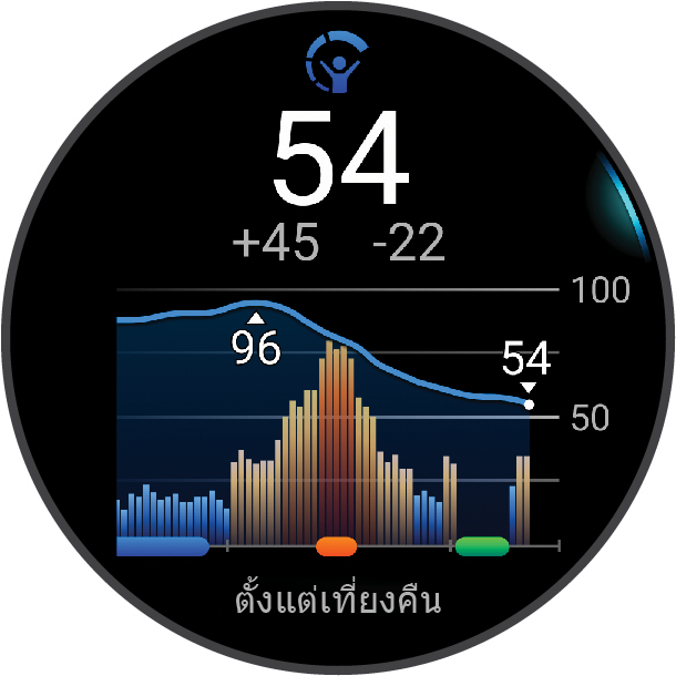 คุณสามารถซิงค์นาฬิกาของคุณกับบัญชี Garmin Connect เพื่อดูระดับแบตเตอรี่ร่างกายล่าสุด แนวโน้มระยะยาว และรายละเอียดเพิ่มเติมได้ (คำแนะนำสำหรับการปรับปรุงข้อมูลแบตเตอรี่ร่างกาย)