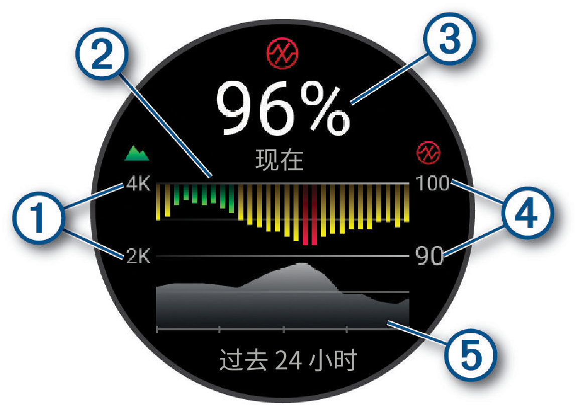 手表具有腕式脉搏血氧传感器,用于测量血液中氧气的饱和度(SpO2)。随着海拔增加,你的脉搏血氧值将会下降。