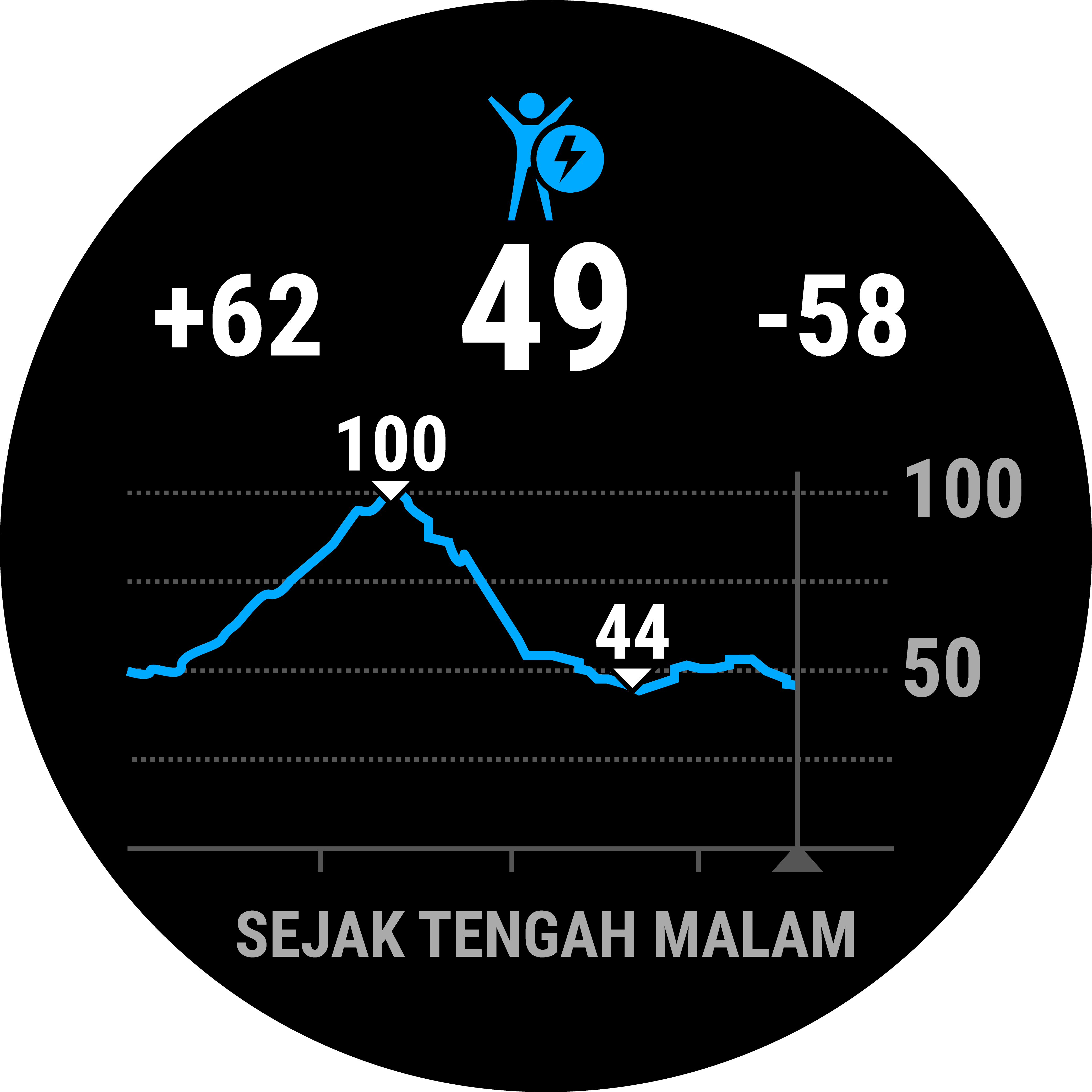 Jam tangan Anda menganalisis variabilitas denyut jantung, tingkat stres, kualitas tidur, dan data aktivitas untuk mengetahui tingkat Body Battery Anda secara keseluruhan. Seperti halnya indikator bahan bakar pada kendaraan, fitur ini menunjukkan jumlah cadangan energi yang tersedia. Tingkat Body Battery berkisar mulai dari 0 hingga 100, dengan 0 hingga 25 berarti cadangan energi rendah, 26 hingga 50 berarti cadangan energi sedang, 51 hingga 75 berarti cadangan energi tinggi, dan 76 hingga 100 berarti cadangan energi sangat tinggi.