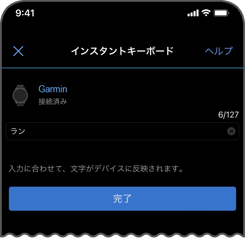 デバイスでの文字入力時にアプリのインスタントキーボード機能を使用すれば、スムーズな文字入力が可能になります。デバイスに文字入力画面が表示されると、同時にスマートフォンのGarmin Connect アプリの画面にインスタントキーボードが表示されます。インスタントキーボードが表示されたら、入力欄にスマートフォンのキーボードを使用して文字を入力します。入力した文字は、デバイスの文字入力画面にリアルタイムで反映されます。入力が終わったら、[完了]を選択して終了します。