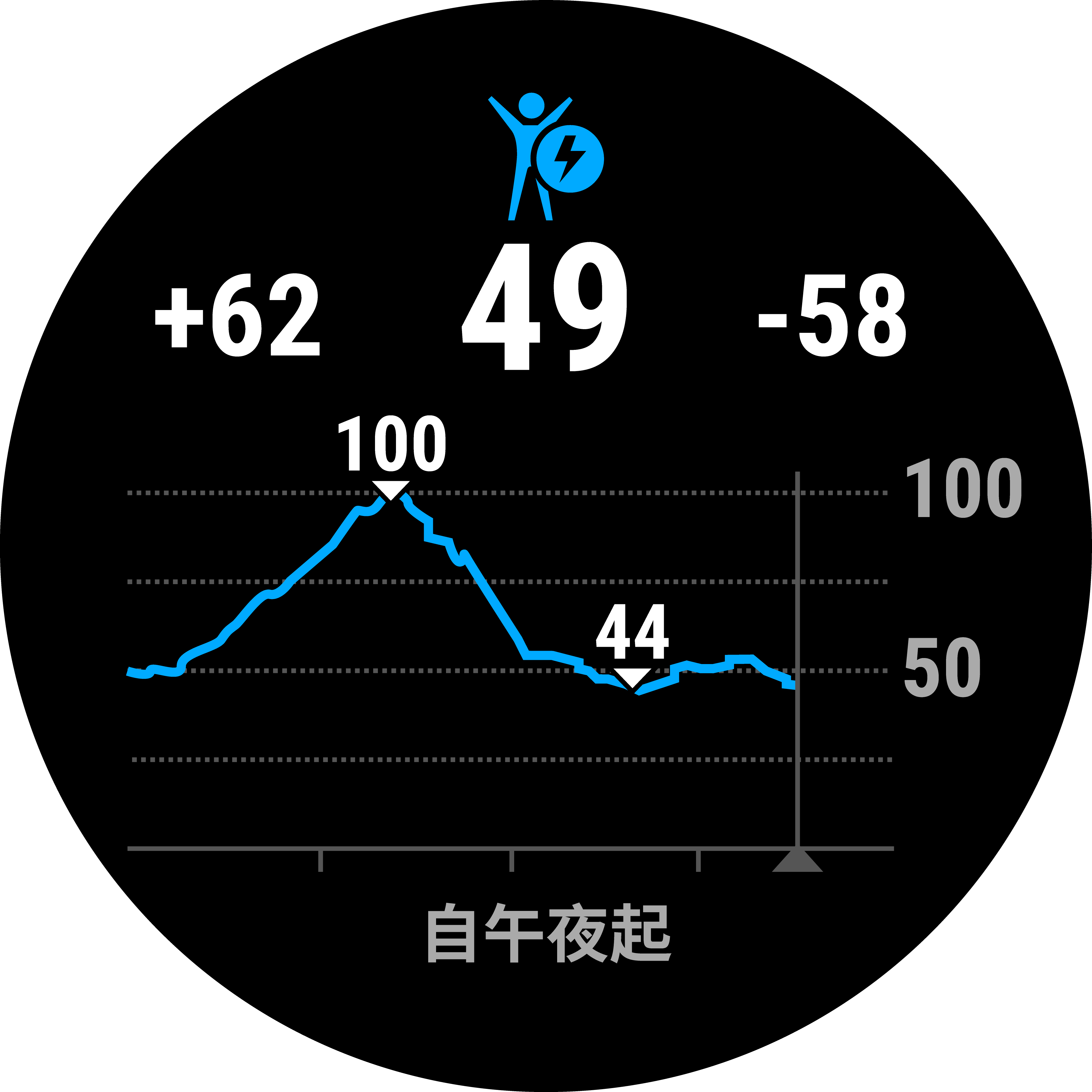 设备会分析你的心率变异值、压力等级、睡眠品质和活动数据来估计身体电量。身体电量就像汽车油表,代表可用的储备能量。身体电量范围介于 0 到 100。0 到 25 代表低储备能量;26 到 50 代表中储备能量;51 到 75 代表高储备能量;76 到 100代表极高储备能量。
