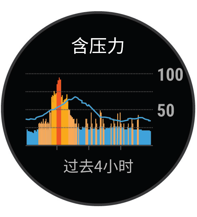 蓝色代表休息期间、橘色代表压力期间,灰色则代表太过活跃,无法侦测压力等级。