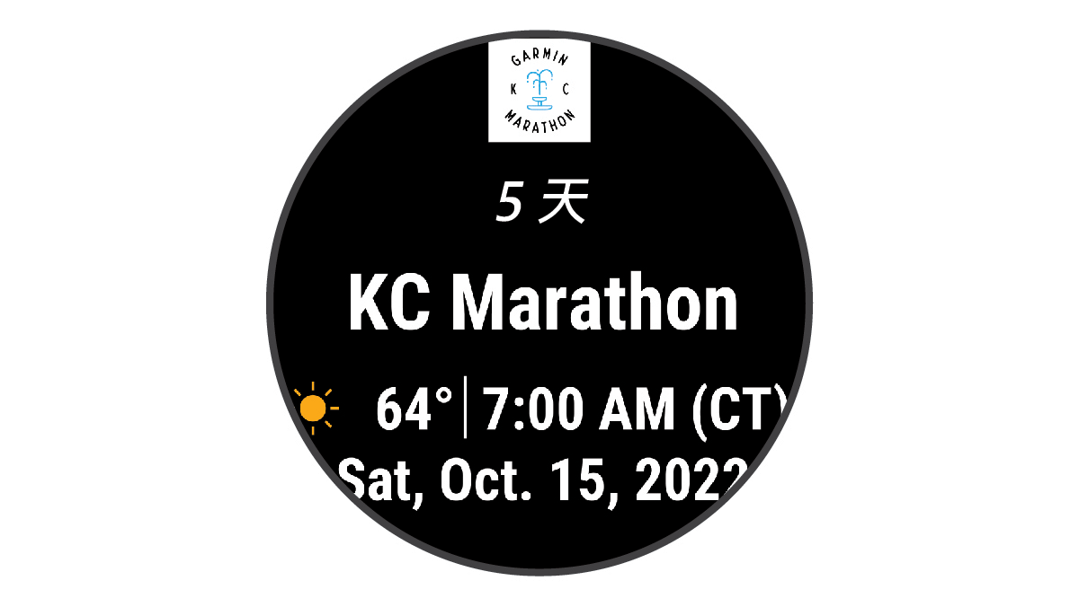 赛事日历和主要赛事当在您的Garmin Connect日历中添加赛事时,你可以在主要赛事小工具中查看此赛事(小工具,第6页)。赛事日期必须在未来365天内。手表会显示赛事倒计时,你的目标时间或预测完成时间(仅限赛事),以及天气信息。注意:可以立即获得比赛地点和日期的历史天气信息。当地的预报数据大约在赛事发生前14天显示。如果您添加了多个赛事,需要选择一个主要赛事。根据你赛事的路线信息,您可以查看海拔数据、路线,并添加配速策略计划(PacePro 配速策略,第17页)。主页训练赛事助手赛事日历和主要赛事