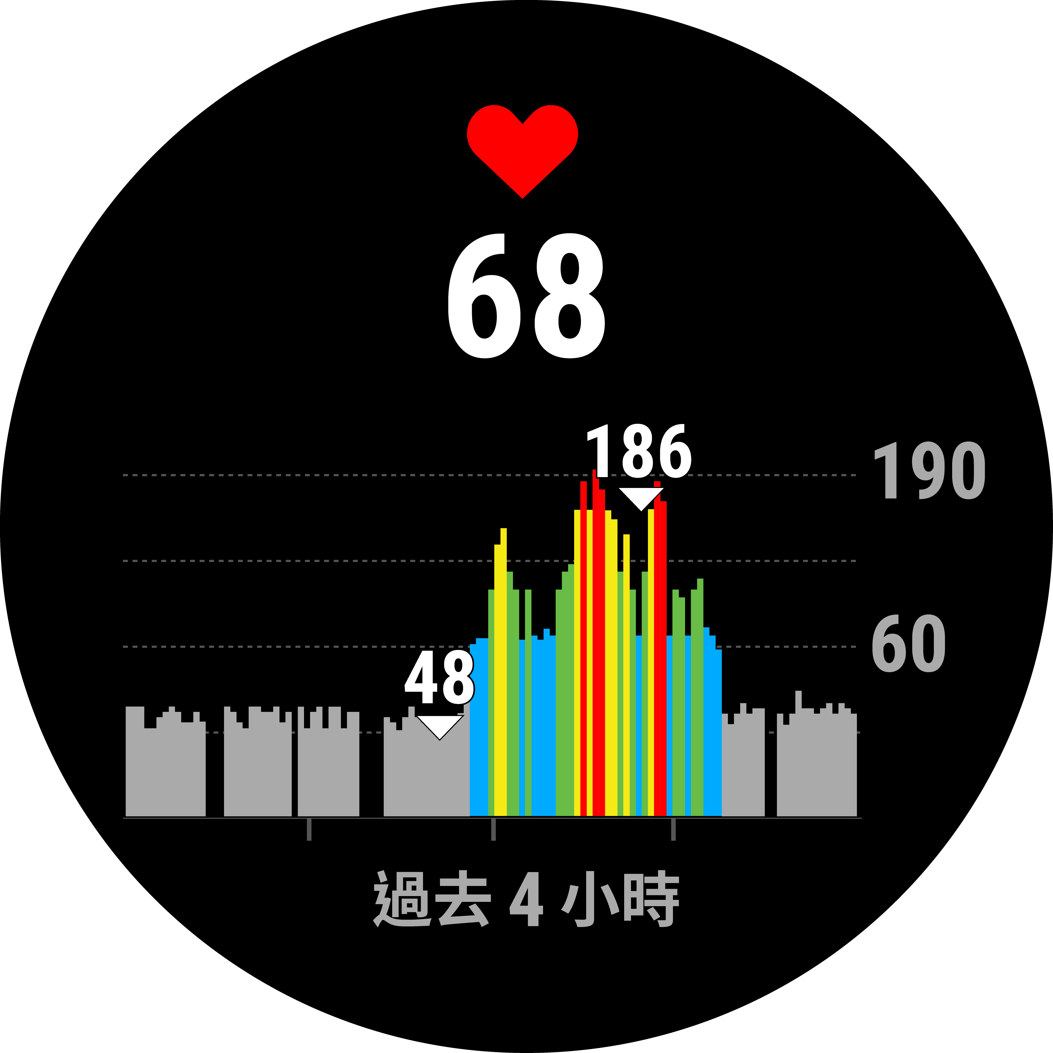 檢視心率概覽 在時間錶面按下 UP 鍵或 DOWN 鍵以檢視心率概覽。 備註:您可能需要先將概覽加到您的概覽循環清單中(自訂概覽循環清單)。 按下 START 鍵檢視您目前每分鐘的心率(bpm)與過去 4 小時的心率圖。 按下 DOWN 鍵以檢視過去 7 天的平均靜止心率。 首頁外觀概覽檢視心率概覽