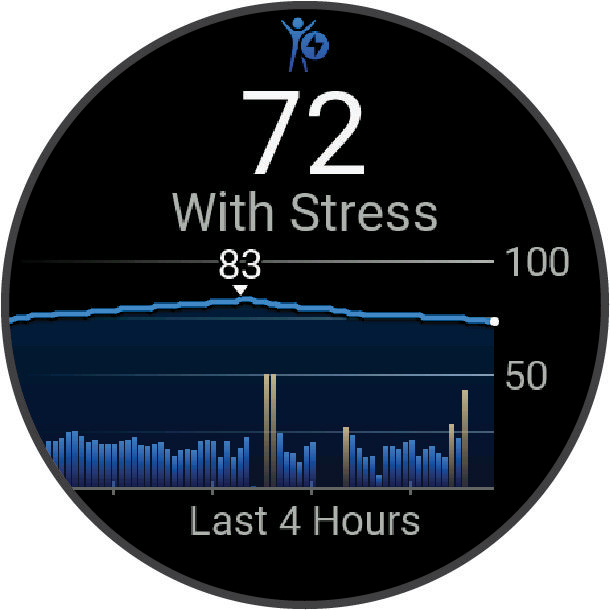 워치는 사용자의 심박수 변이, 스트레스 수준, 수면의 질, 활동 데이터를 분석하여 전체적인 바디 배터리 수준을 알아냅니다. 자동차의 연료량 표시처럼 이것은 사용자에게 남아 있는 에너지의 양을 보여줍니다. 바디 배터리의 범위는 0~100 이며, 여기에서 0~25 범위는 낮은 에너지가 남아 있음을 의미하고, 26~50은 중간 정도의 에너지가 있음을 의미하며, 51~75 범위는 높은 에너지를 의미하며, 76~100은 매우 높은 에너지가 있음을 의미합니다.