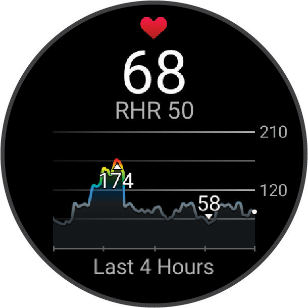 - START를 눌러서 분당박동수(bpm) 단위의 현재 심박수와 지난 4 시간 동안의 심박수를 확인합니다.
