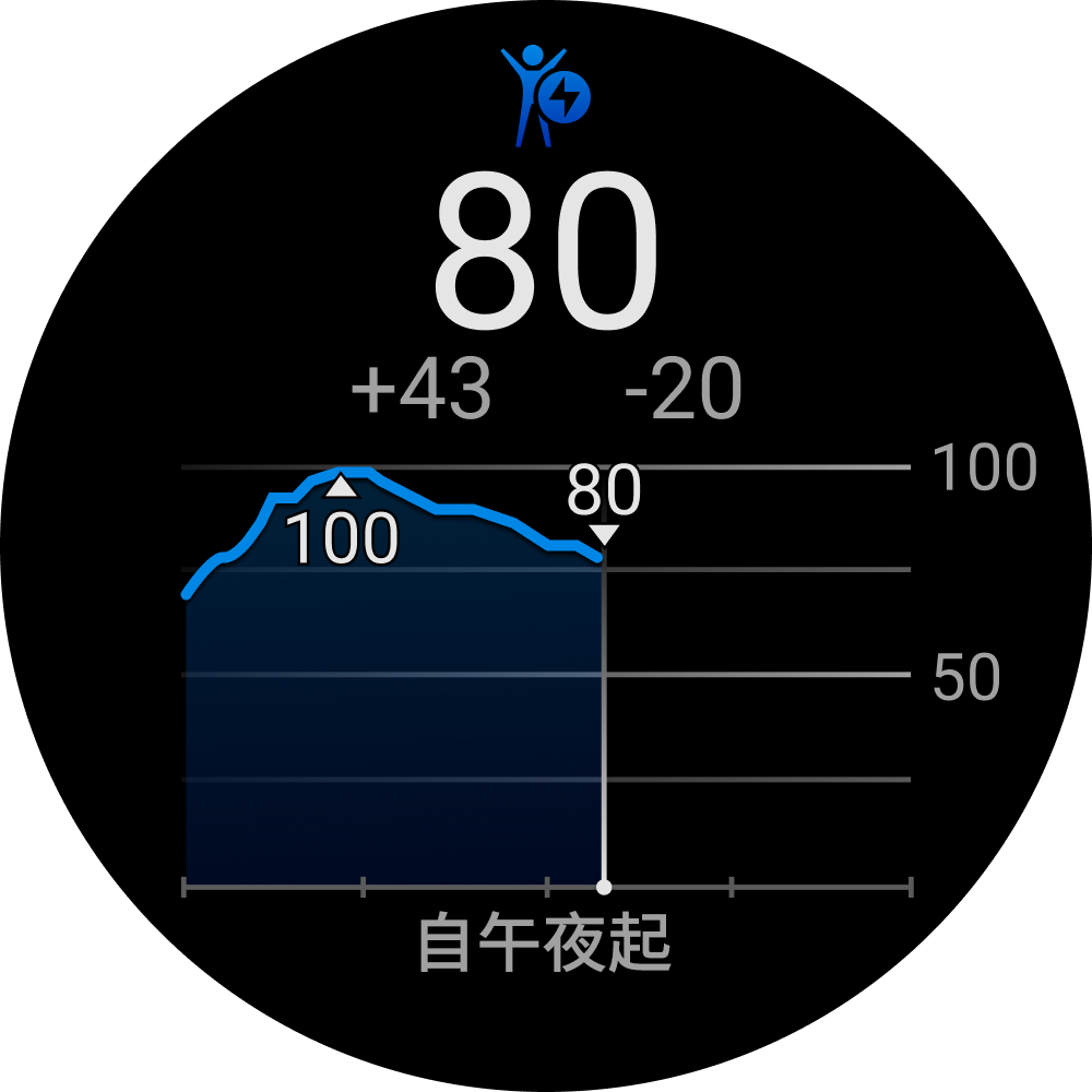 设备会分析你的心率变异值、压力等级、睡眠品质和活动数据来估计身体电量。身体电量就像汽车油表,代表可用的储备能量 。身体电量范围介于 0 到 100。0 到 25 代表低储备能量;26 到 50 代表中储备能量;51 到 75 代表高储备能量;76 到 100代表极高储备能量。