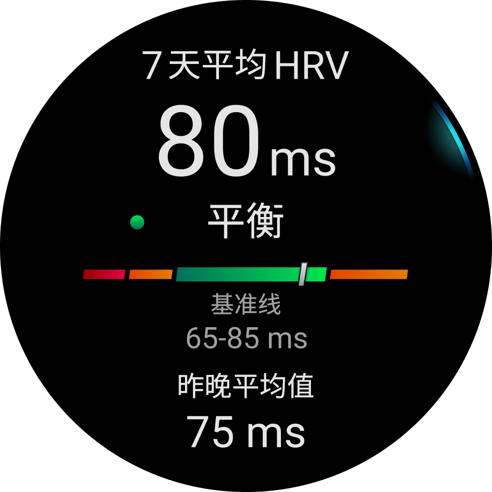 手表通过分析你睡觉期间的心率读数获取基于个人心率变异值(HRV)状态。训练、体育活动、睡眠、营养和健康习惯都会影响你的心率变化。HRV值因性别、年龄和健康水平而有很大的差异。平衡的HRV状态可能表示健康的积极迹象,如良好的训练和恢复平衡,更强的心血管健康,以及应对压力的适应能力。不平衡的状态或状态不佳可能是疲劳、需要更长的恢复或压力增加的表现。为了达到最佳的效果,请睡觉时佩戴手表。这款手表需要连续三周的睡眠数据来显示您的心率变异状态。
