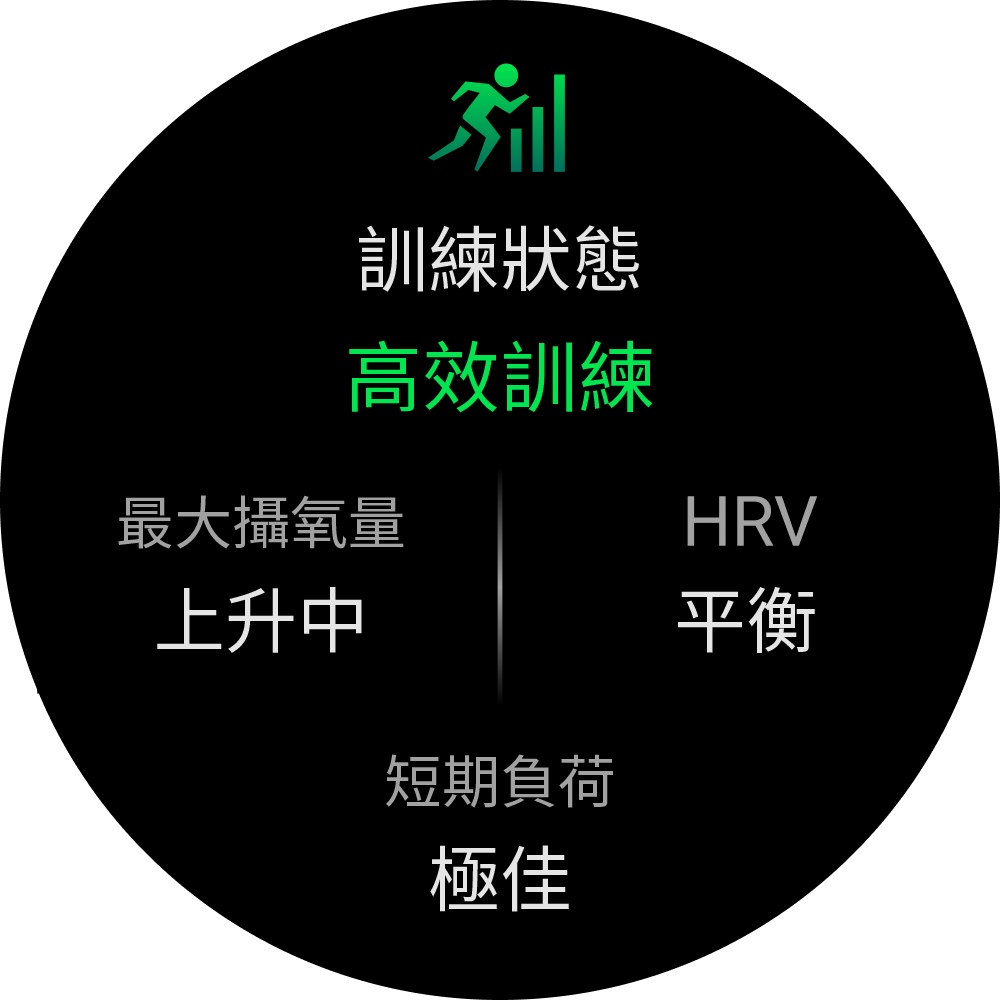 訓練狀態顯示訓練對體能與表現的影響。訓練狀態以最大攝氧量、短期負荷及 HRV 狀態的長時間變化為根據。您可以根據訓練狀態規劃未來的訓練並持續提升體能。