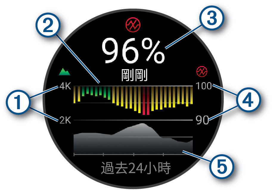 脈搏血氧感測功能以圖形、百分比和顏色顯示血氧飽和度。您可以在 Garmin Connect 檢視有關脈搏血氧功能的其他詳細資訊,以及過去特定期間的趨勢。