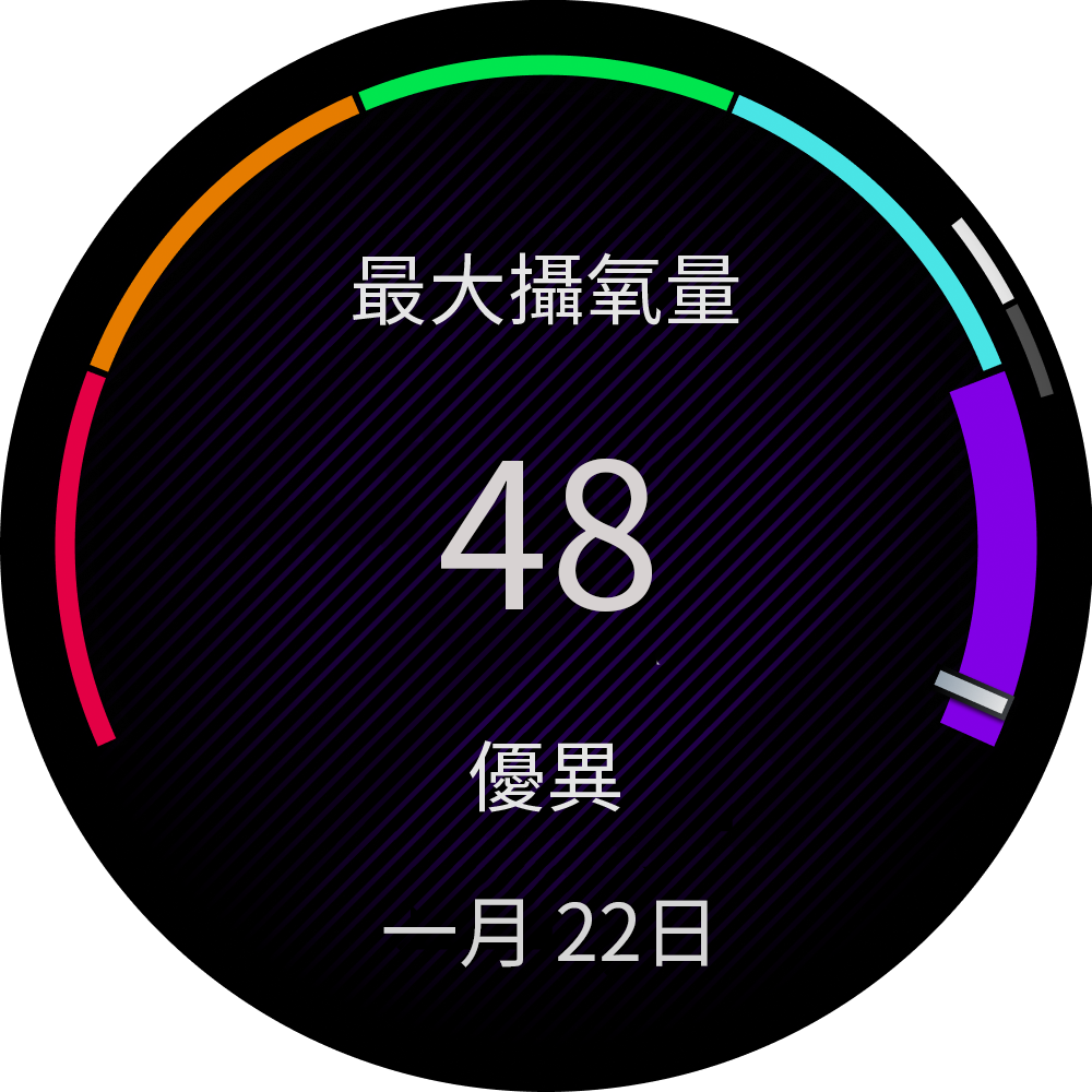 最大攝氧量(VO2 Max.):最大攝氧量是您表現最好時,每公斤的體重每分鐘最多能消耗的氧量(以毫升為單位)(關於最大攝氧量(VO2 Max.)的估算值)。