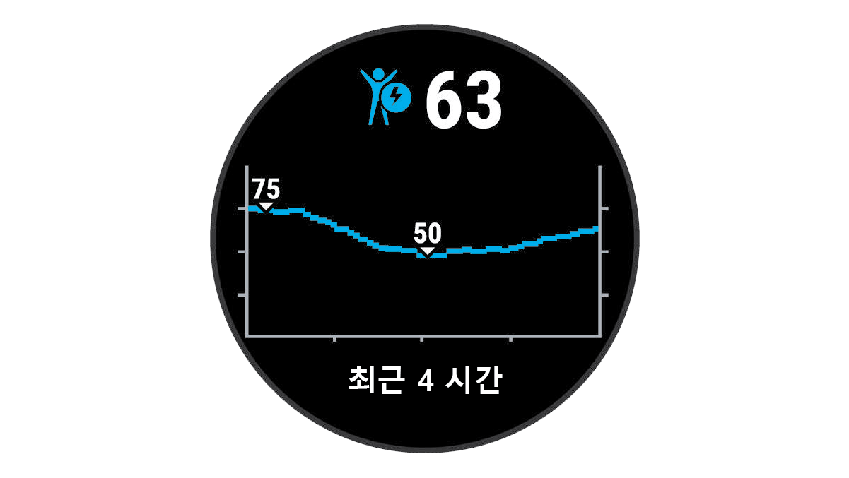 바디 배터리 위젯은 현재의 바디 배터리 수준과 최근 몇 시간 동안의 바디 배터리 수준을 보여주는 그래프를 화면에 표시합니다.