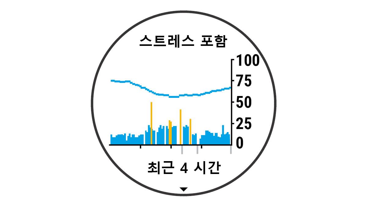 청색 바는 안정 상태의 시간을 나타냅니다. 주황색 바는 스트레스 상태의 시간을 나타냅니다. 회색 바는 스트레스 수준을 알아내기에는 사용자가 너무 활동적이었던 시간을 나타냅니다.