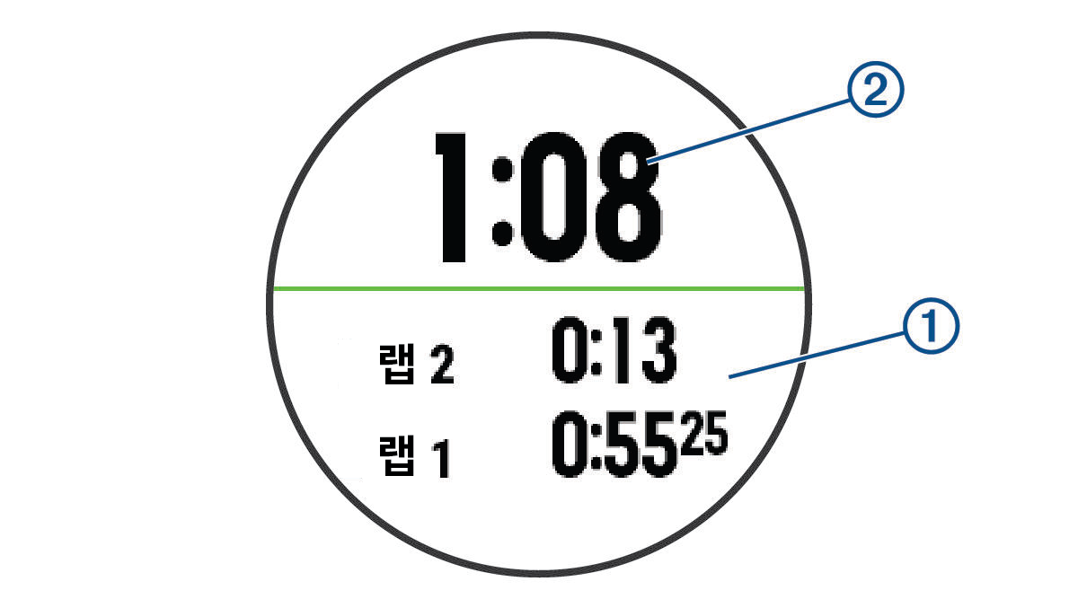 스톱위치 사용하기 아무 화면에서든 LIGHT를 길게 누릅니다. 스톱워치를 선택합니다. START를 눌러 타이머를 시작합니다. 랩 타이머①를 다시 시작하려면 BACK을 누릅니다. 전체 스톱워치 시간 ②이 계속 흐릅니다. 두 타이머를 모두 멈추려면 START를 누릅니다. 옵션을 선택합니다. 기록된 시간을 활동으로서 사용자의 운동기록에 저장합니다 (선택사항). 홈장치 사용자 지정하기시계스톱위치 사용하기