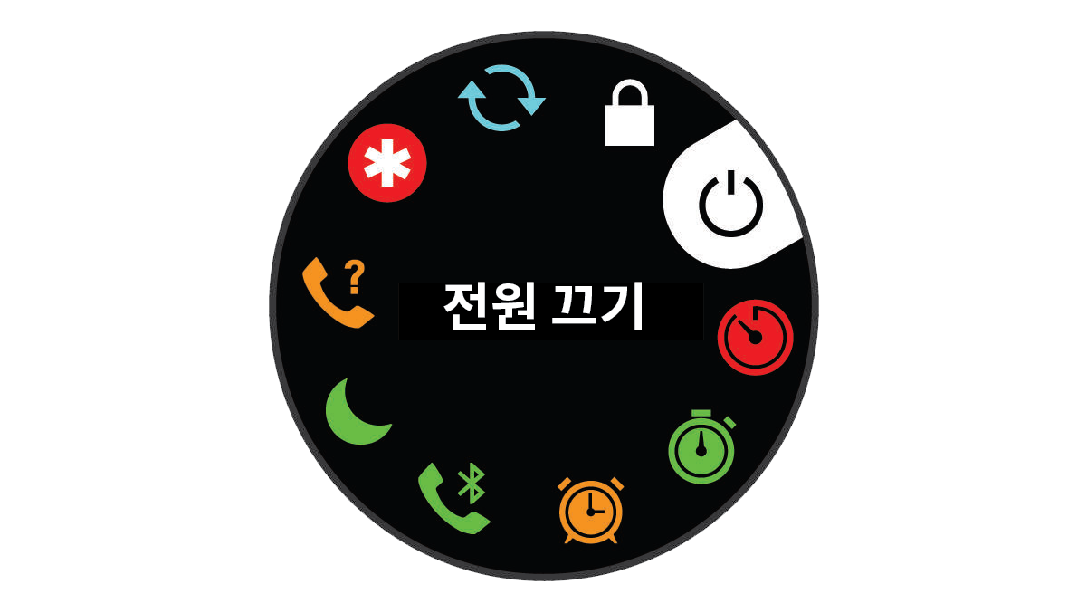 컨트롤 메뉴 보기컨트롤 메뉴는 방해 금지 모드 켜기, 키 잠그기, 장치 끄기와 같은 단축키 메뉴 옵션을 포함하고 있습니다. 아무 화면에서든 LIGHT를 길게 누릅니다. UP 또는 DOWN을 눌러 옵션을 스크롤합니다. 홈소개컨트롤 메뉴 보기