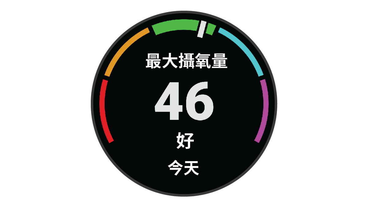 最大攝氧量(VO2 Max.)是您在表現最好時,每分鐘每公斤體重的最大耗氧量(以毫升為單位)。簡單來說,最大攝氧量是運動成效的指標,而且它應該會隨著您的體能進步而提升。要得到您的最大攝氧量,需要腕式心率或相容的心率帶進行監測。