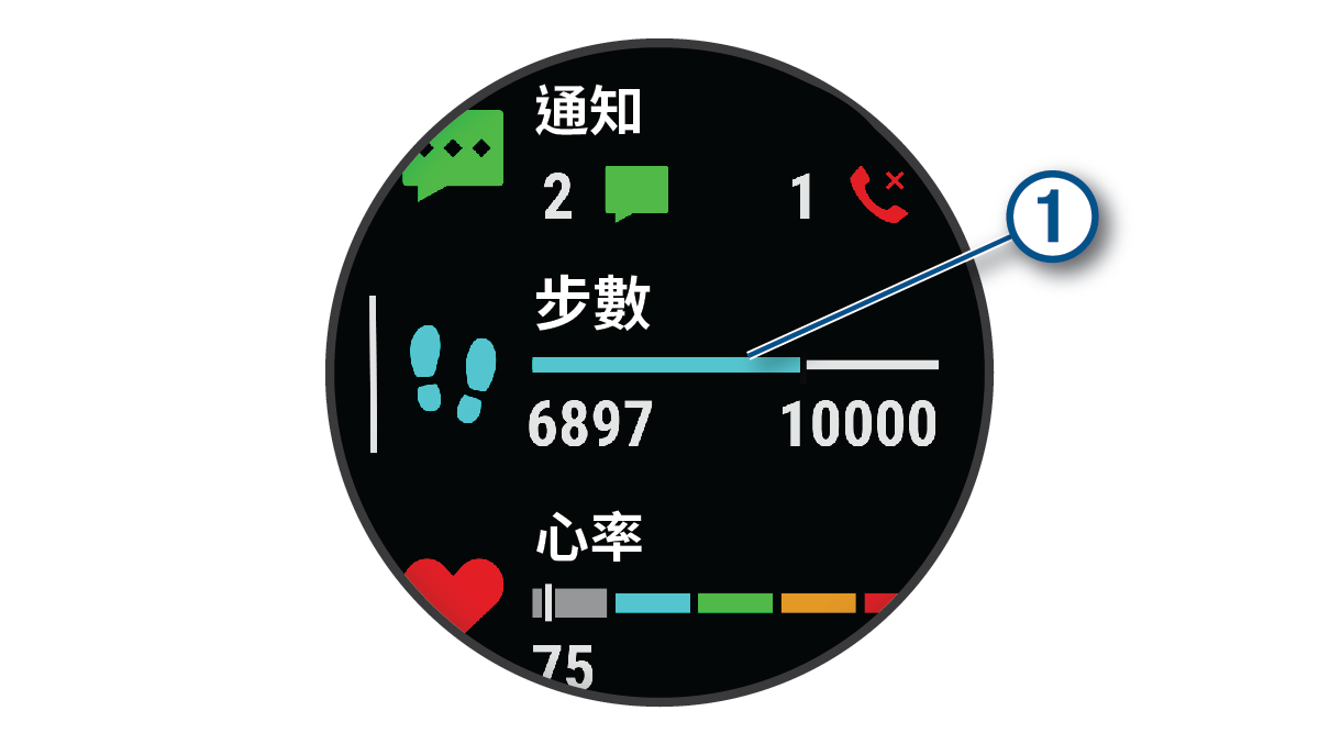 自動目標裝置會根據您先前的活動等級,計算您的每日步數目標。裝置會隨著您一日的活動,顯示您邁向每日目標的進度 ①。如果不想使用自動暫停功能,您可以在 Garmin Connect 帳戶中自訂目標步數。首頁活動追蹤自動目標