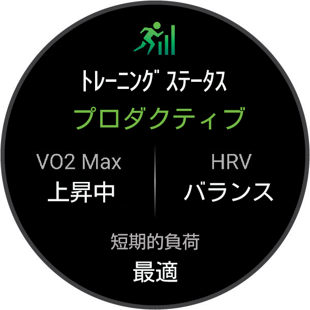 トレーニングステータス:VO2 Maxと短期的負荷、HRVステータスの長期間のデータを基に、トレーニングが自身のパフォーマンスにもたらす効果を示します。