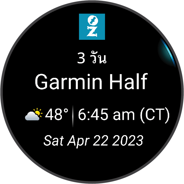 เมื่อคุณเพิ่มงานการแข่งไปยังปฏิทิน Garmin Connect ของคุณ คุณสามารถดูงานบนนาฬิกาของคุณโดยการเพิ่ม glance การแข่งหลัก (ภาพรวม) วันงานต้องเป็น 365 วันข้างหน้า นาฬิกาแสดงการนับถอยหลังถึงวันงาน เวลาเข้าเส้นชัย หรือคาดการณ์เวลาเสร็จสิ้น (กิจกรรมการวิ่งเท่านั้น) และข้อมูลสภาพอากาศ