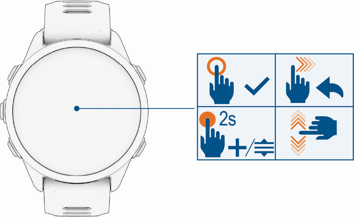 觸控螢幕功能 點一下以選取選單內的選項。 長按時間錶面上的數據開啟概覽或功能。 備註:此功能不適用於所有錶面。 點一下錶面頂端的圖示以繼續使用目前的應用程式或活動。 從控制項、概覽或應用程式選單中,長按錶面以編輯、新增或重新排序選項。 在時間錶面,向下滑以檢視通知中心。 在時間錶面,向上滑以捲動瀏覽概覽清單。 向上或向下滑以捲動瀏覽選單。 向右滑以返回前一個畫面。 用手掌蓋住螢幕以返回時間錶面並降低螢幕亮度。 啟用或停用觸控螢幕首頁產品介紹觸控螢幕功能