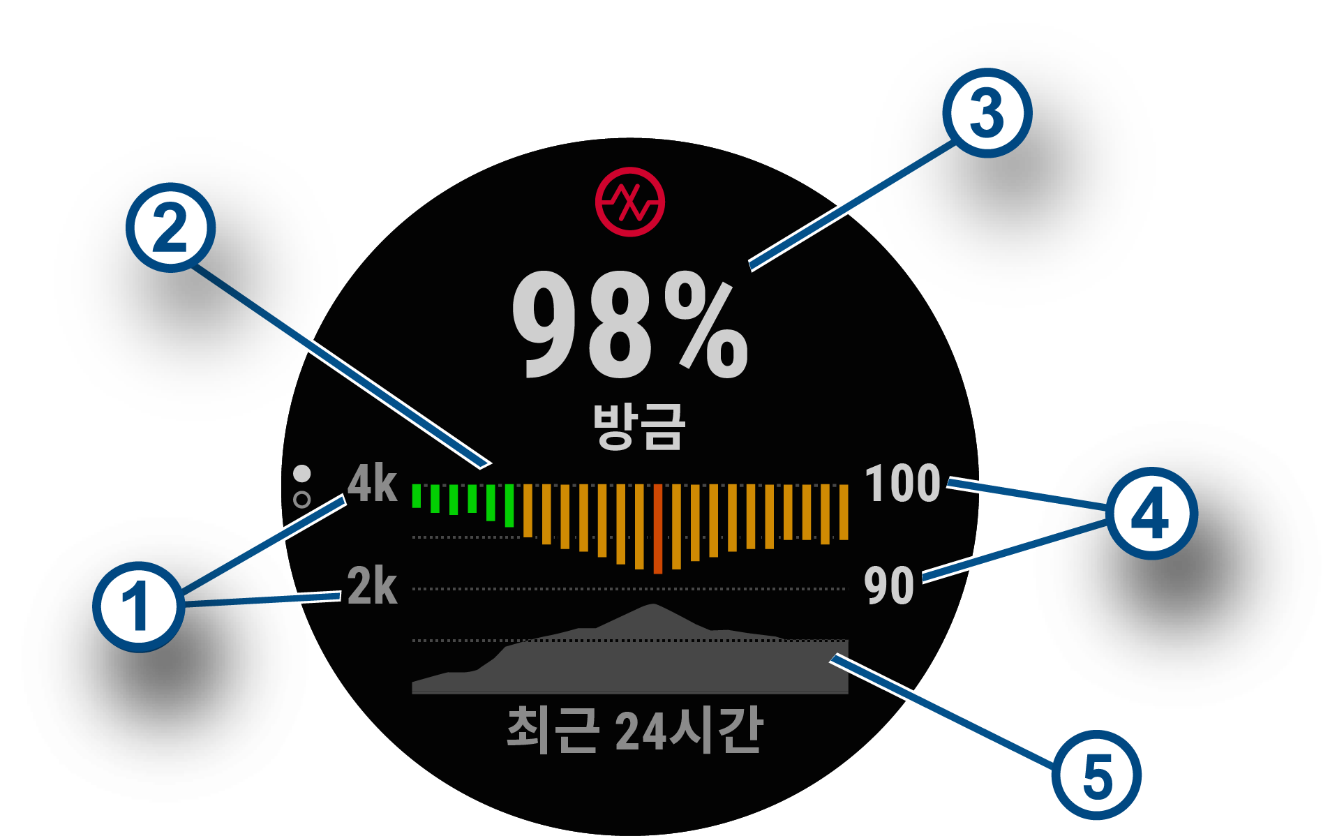 장치는 펄스 옥시미터 계측값을 산소 포화도 퍼센티지와 그래프의 색상으로 표시합니다. Garmin Connect 계정에서는 수 일 동안의 경향을 비롯하여 펄스 옥시미터 계측값에 대한 상세한 정보를 추가적으로 확인할 수 있습니다.