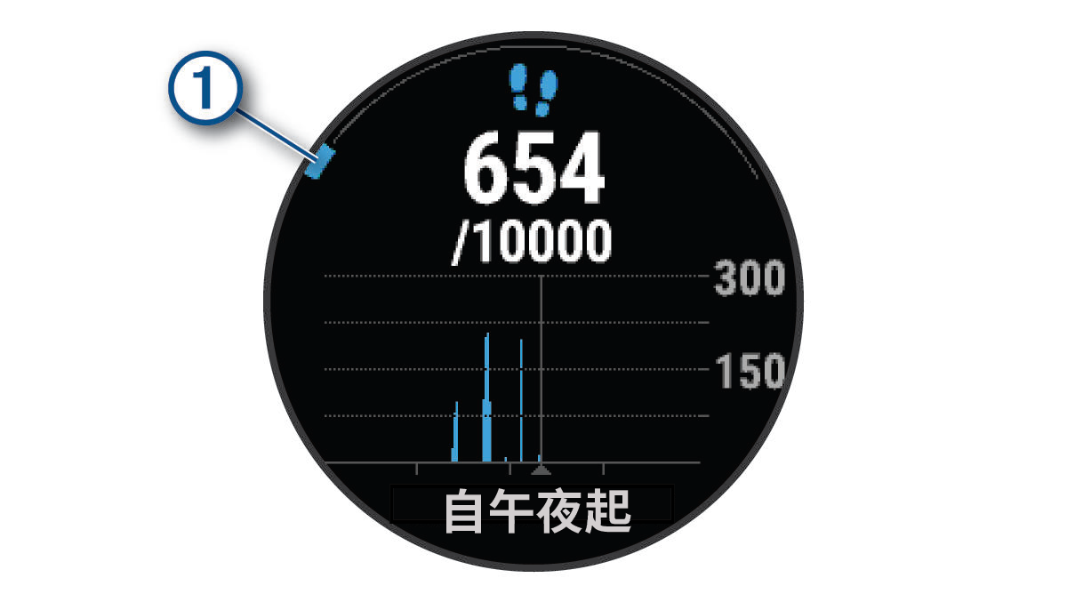 设备会根据您的个人基本数据与活动等级,计算您的每日步数目标,并显示于屏幕 ①。