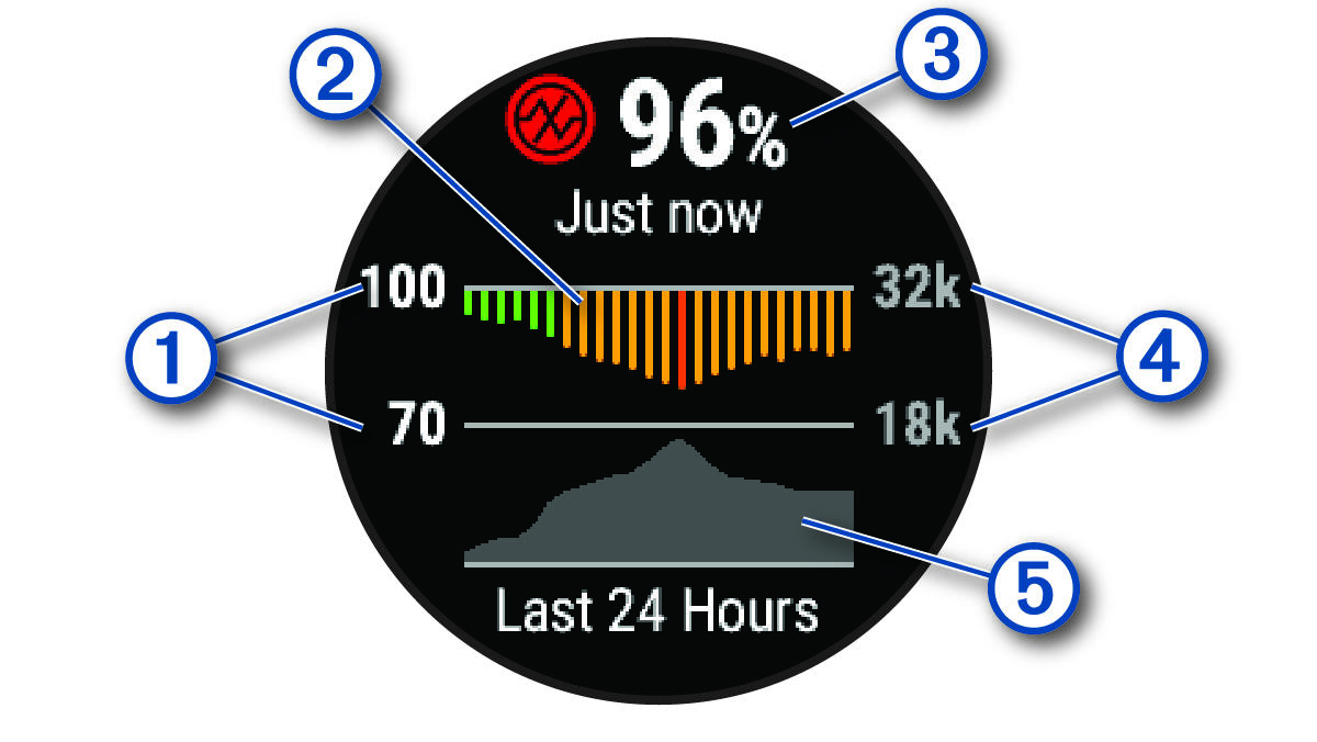 장치는 펄스 옥시미터 계측값을 산소 포화도 퍼센티지와 그래프의 색상으로 표시합니다. Garmin Connect 계정에서는 수 일 동안의 경향을 비롯하여 펄스 옥시미터 계측값에 대한 상세한 정보를 추가적으로 확인할 수 있습니다.