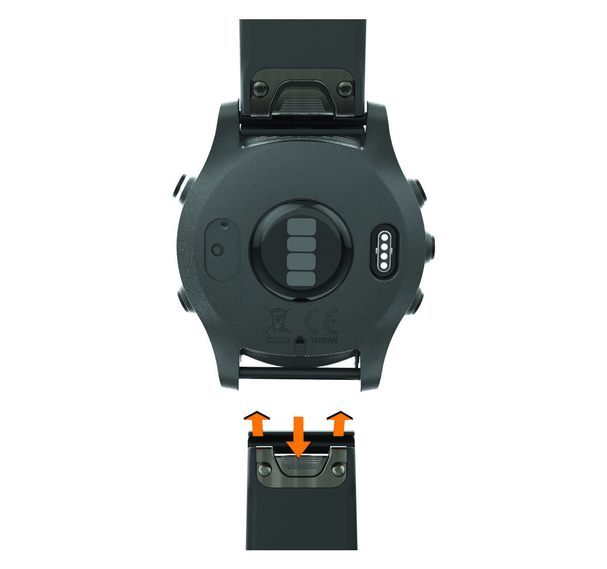 - Forerunner 밴드를 설치하려면, 새로운 밴드를 시계에 정렬하고 두 개의 드라이버를 사용하여 핀을 교체합니다.