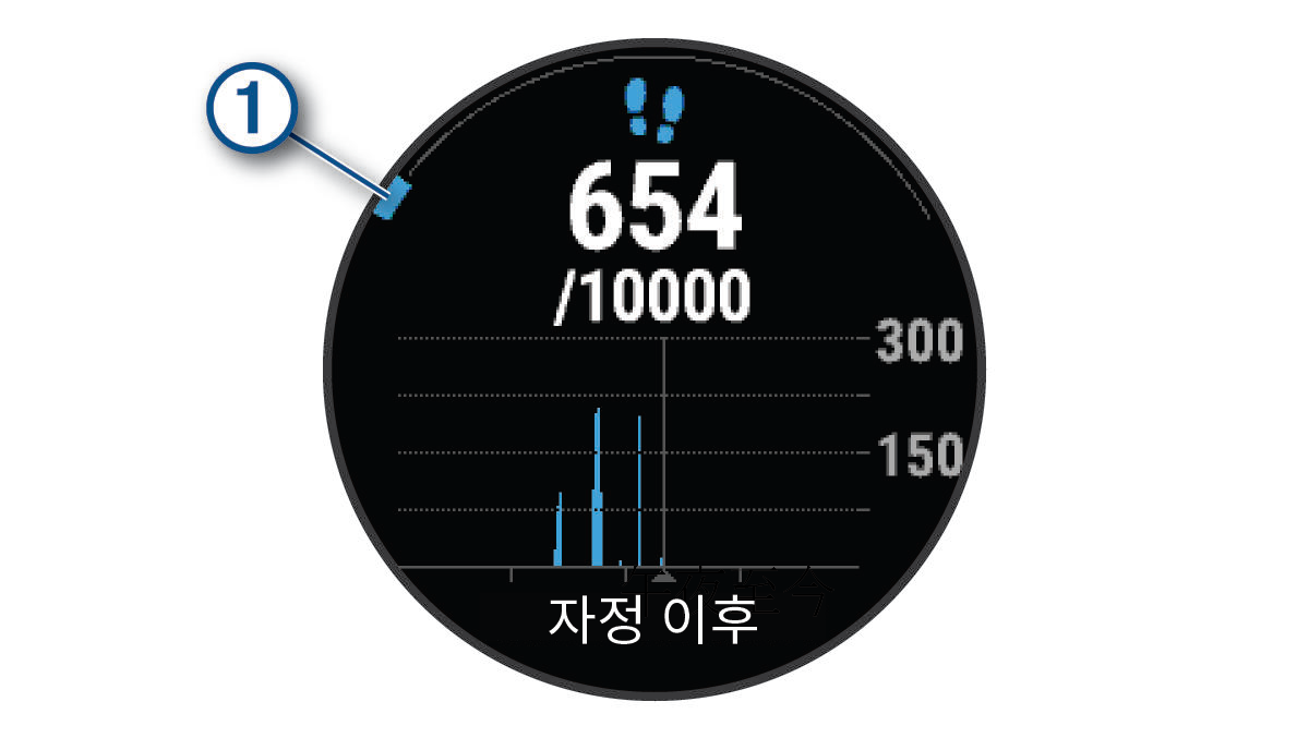 목표 자동 생성(Auto Goal)이전 활동 수준을 기준으로 장치에서 자동으로 일일 스텝 목표를 만듭니다. 하루 동안 움직임에 따라 장치에서 일일 목표①에 대한 진행 상황을 보여줍니다.목표 자동 생성 기능을 사용하지 않기로 선택하였다면, Garmin Connect 계정에서 자신만의 단계 목표를 설정할 수도 있습니다.홈훈련운동량 측정목표 자동 생성(Auto Goal)