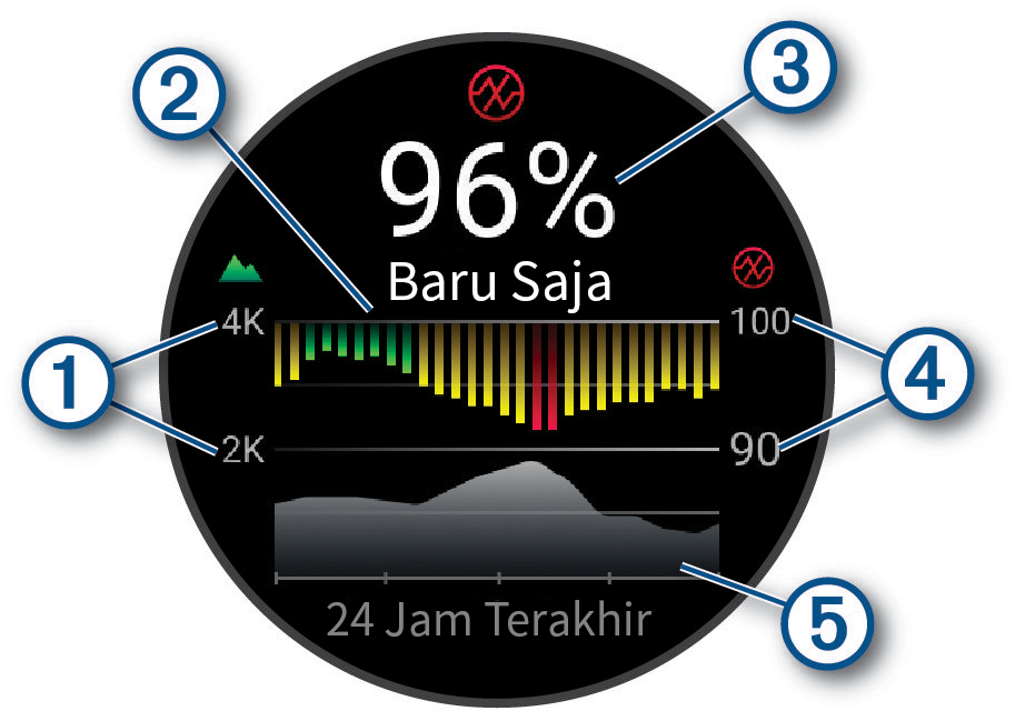 Di jam tangan, pembacaan pulse oximeter akan muncul sebagai persentase saturasi oksigen dan warna pada grafik. Di akun Garmin Connect, Anda dapat melihat rincian tambahan tentang pembacaan pulse oximeter, termasuk tren selama beberapa hari.